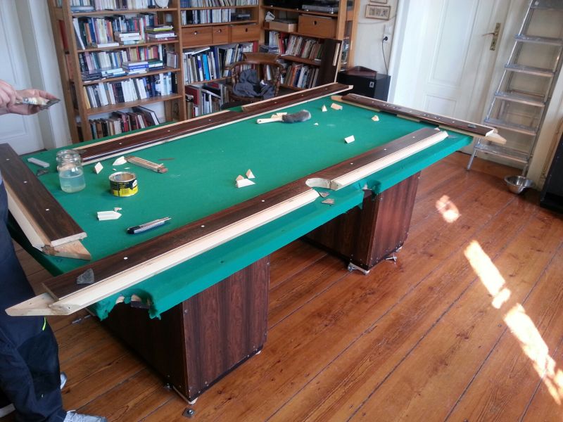 seit Ihrem Einsatz haben wir zweimal gespielt und festgestellt, daß Sie den Tisch nicht nur hervorragend bezogen haben, sondern auch Ihr Rat, die Banden mitzubeziehen, richtig war. Außerdem habe ich ein besseres Gefühl, da die Einläufe der Ecktaschen millimetergenau dem Reglement entsprechen. Auf die vorherige Verwechslung der Kopf- und Fußbande wäre ich nicht gekommen aber dafür sind Sie ja Fachmann.